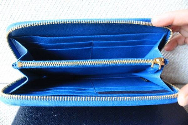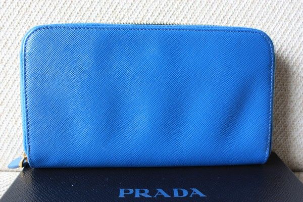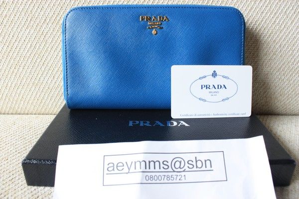 9. New Prada Saffiano Calf Leather Wallet กระเป๋าตังค์ใหม่ สีฟ้า สวยใสๆ อุปกรณ์มี การ์ด กล่อง ราคา 14,000 บาท