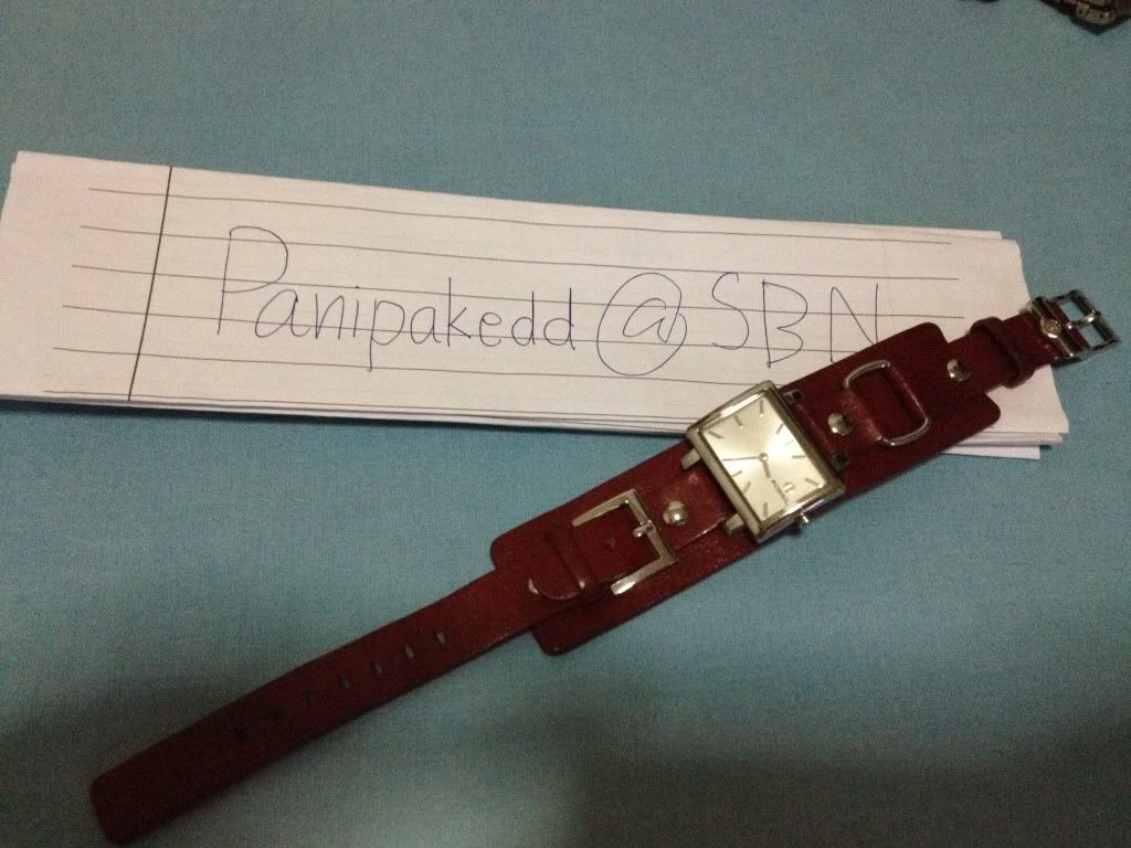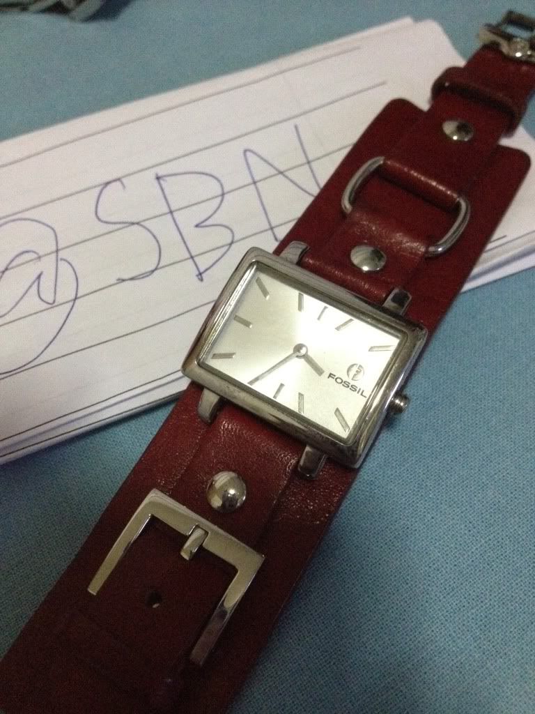 สายสีแดงเลือดหมูนะคะ ตัวหน้าปัดไม่มีรอยถลอกค่ะ ตัวอะไหล่สีเงืนก็ไม่ลอก สายยังแข้งอยู่เลยนะคะ