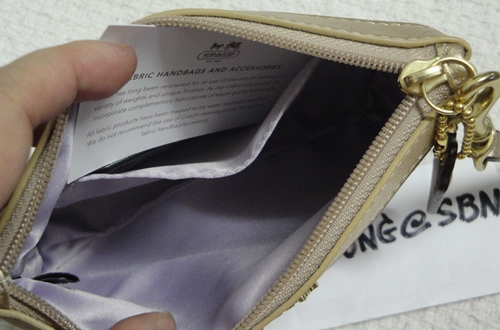 4. COACH - 61970 Madison Metallic Leather Universal Case สี Champagne (สีแชมเปญ) กระเป๋าคล้องมือขนาด 5.5*3.5 นิ้ว กระทัดรัด หนังทั้งใบ ใส่ Iphone และ Balckberry ได้ มีช่องใส่บัตรได้ 3 ใบ และช่องเอนกประสงค์ 1 ช่อง เป็นของใหม่ป้ายแนบคะ อุปกรณ์มี น้องเป๋า / Gift receipt และ Care Card ราคา 2,590 บาท