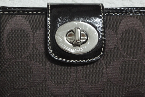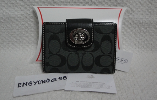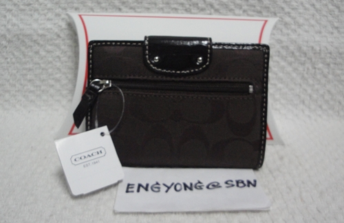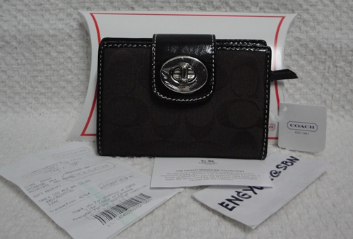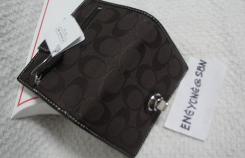 3. COACH - 43612 Turnlock Signature Medium Wallet สี Chocolate ขนาด 5*4 นิ้ว กระเป๋าเงินรุ่นนี้หายากแล้วนะคะ โดยเฉพาะสี Chocolate ใส่บัตรเครดิต ได้ 7 ใบ ด้านหลังมีช่องซิปสำหรับใส่เหรียญ เป็นของใหม่ป้ายห้อยคะ อุปกรณ์มี น้องเป๋า / Gift Receipt / Care Card และกล่อง Coach ราคาพิเศษ 3,390 บาท