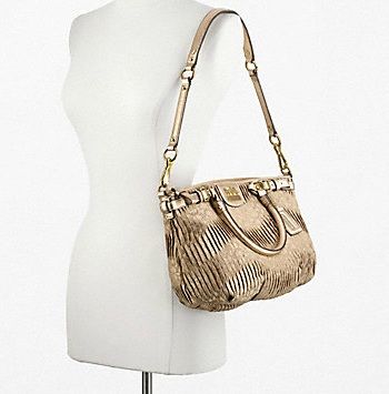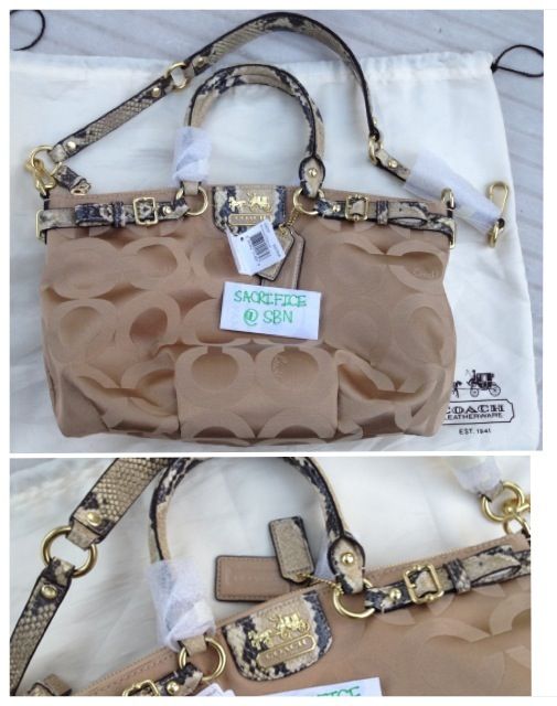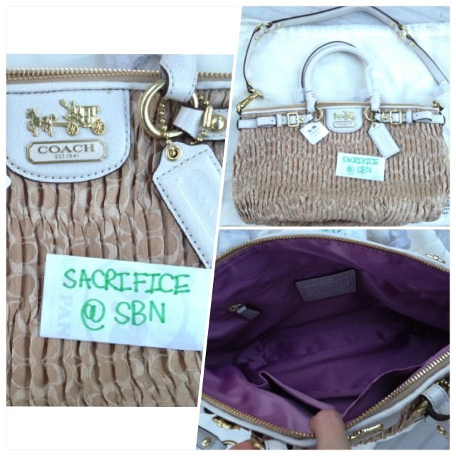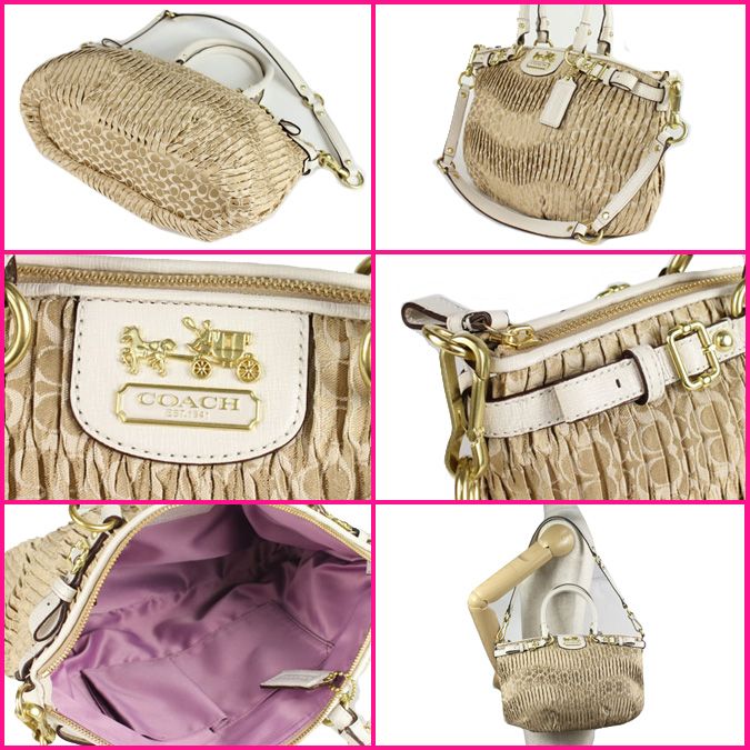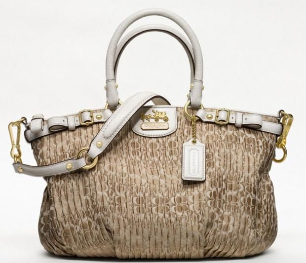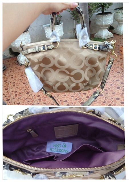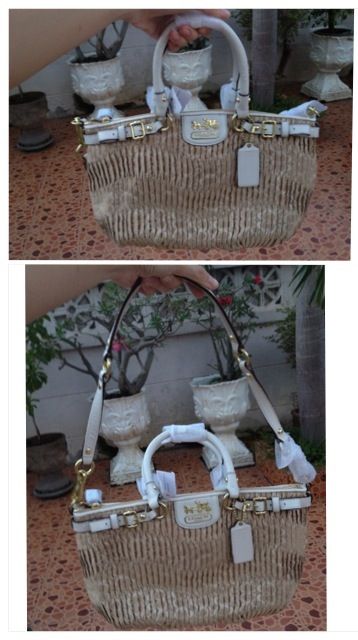 ----->> กระเป๋าสีน้ำตาลอ่อนลายโลโก้COACH ตัวผ้าถูกจับจีบเป็นย่นๆ เป็นลายใหม่ชนชอปเลยนะคะ ตัดกับขอบและหูหิ้วกระเป๋าหนังสีขาว เข้ากันอย่างดี มี2สาย ทั้งหูสั้น และหูยาวนะคะ (หูยาวสามารถถอดออกได้)