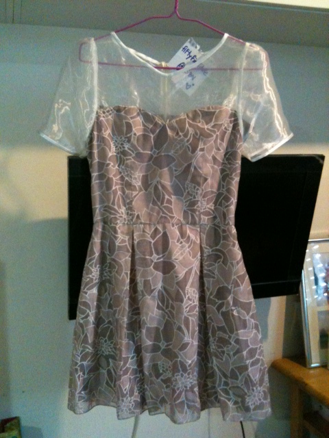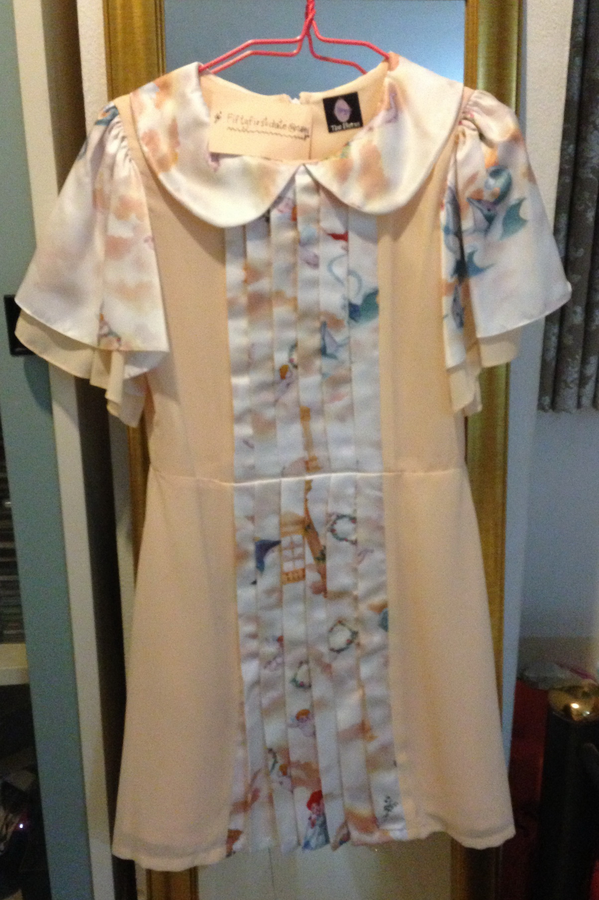Sleeping Sweet autumn dress : เดรสสั้นผ้าซีทรูพิมพ์ลายใบไม้สีนู้ด กระโปรงจับจีบระบาย ช่วงอกแต่งผ้าแก้ว แขนสั้น size S 2490.-