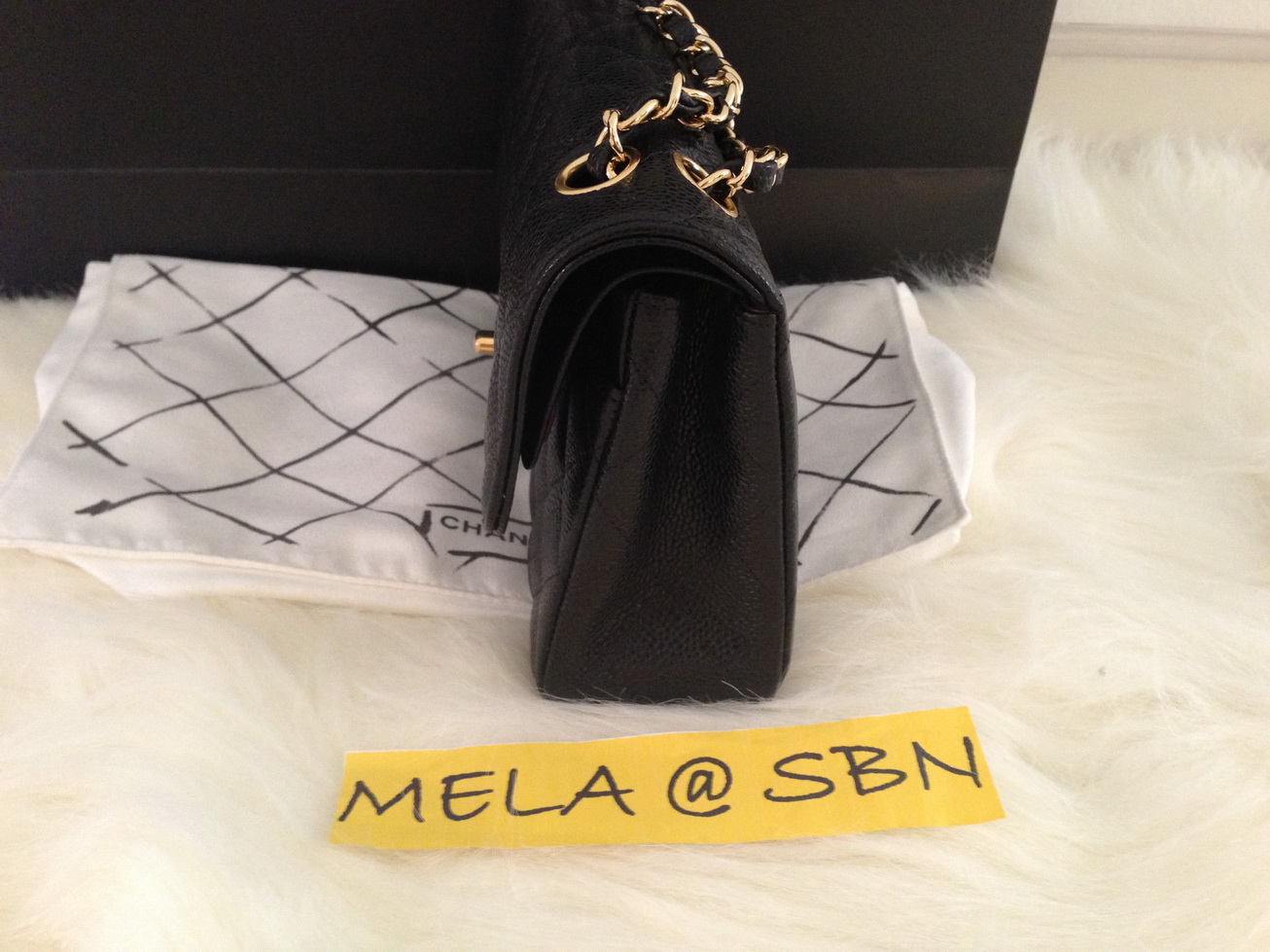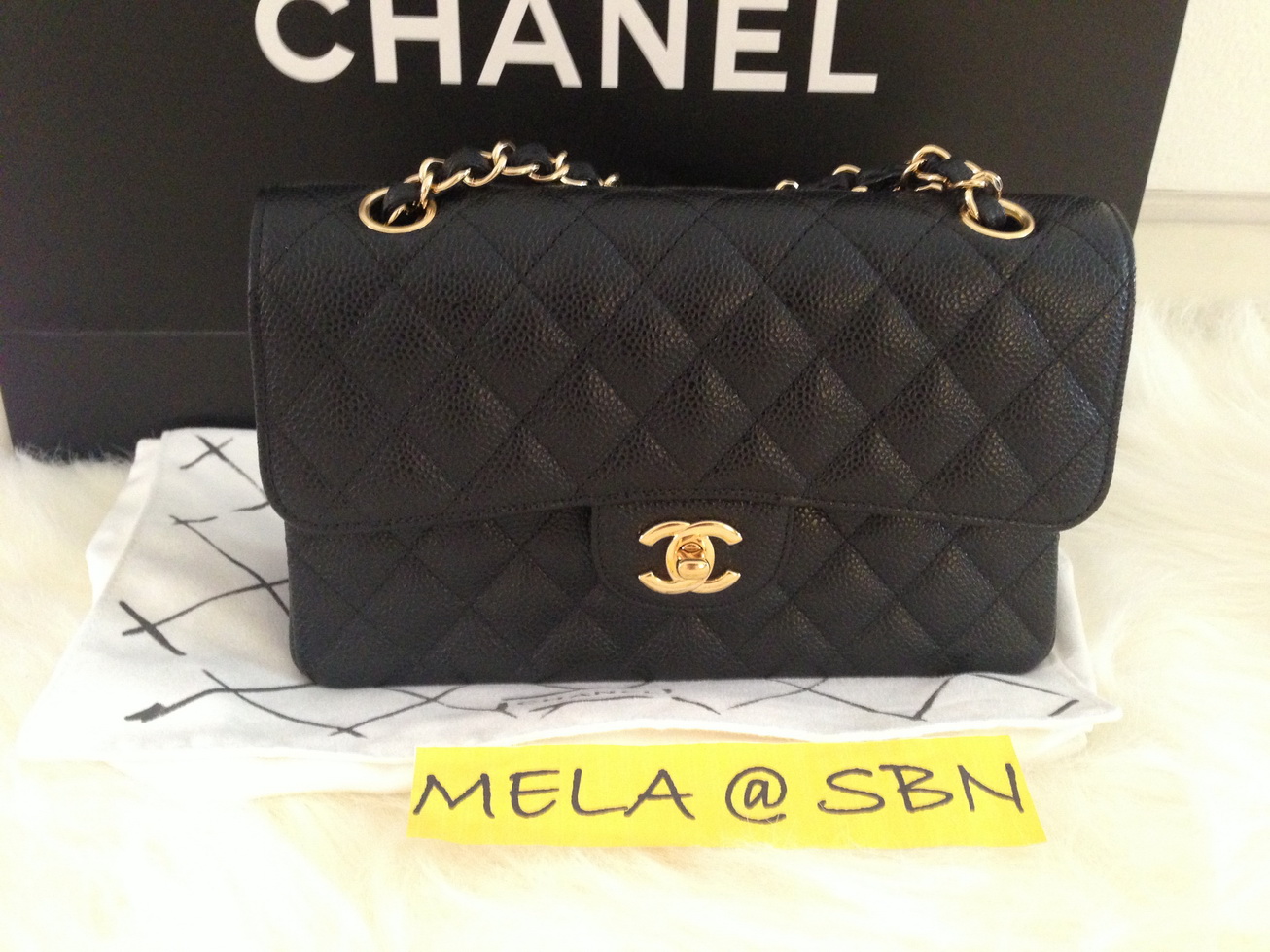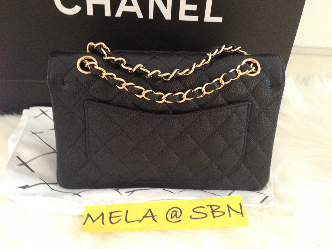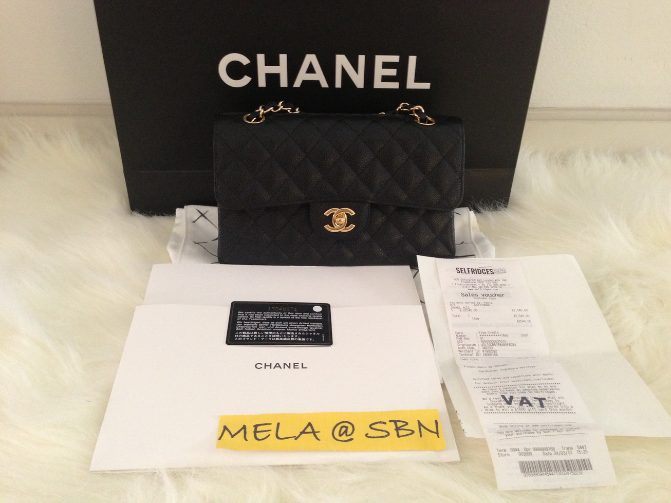 New Chanel classic caviar 9" สีดำ โซ่ทองเพิ่งลงจากเครื่องหมาดๆซื้อวันที่ 24มีนาคม2013 คะ ราคา 118,000 บาทพร้อมถุงผ้า ถุงกระดาษ สมุดบอกวันที่ซื้อ โบว์ ดอกคามิเลียและใบเสร็จตัวจริงจากห้างSelfridges ลอนดอนคะ ไม่มีกล่องนะค่ะ Hologram 17xxxxxx