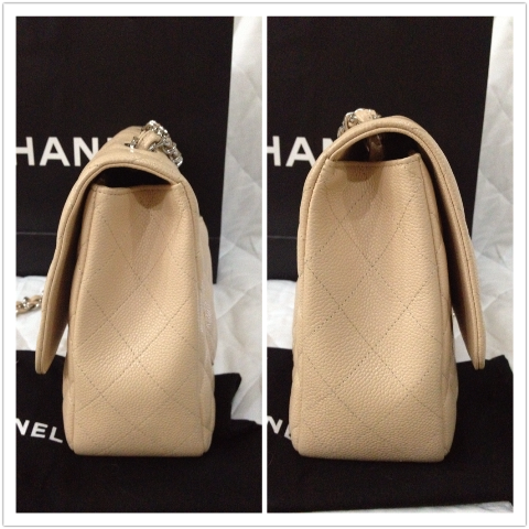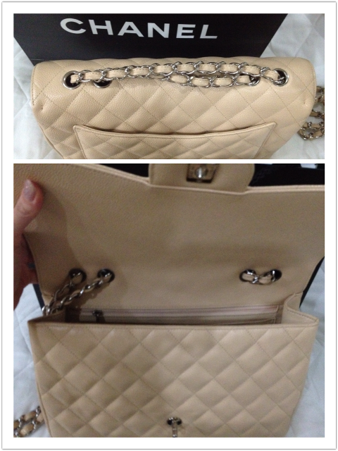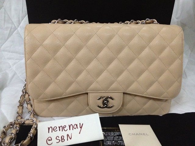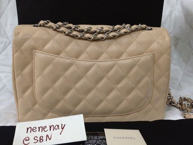 USED LIKE NEW CHANEL CLASSIC JUMBO BEIGE CAVIAR อะไหล่เงิน สีเบจสวยดูดี รุ่นนี้เป็นแบบฝาเดียว น้ำหนักเบากว่ารุ่นใหม่ๆเยอะค่ะ สภาพสวยเลยค่ะ มุมไม่หัก หนังยังป่อง HOLO 13XXXXXX