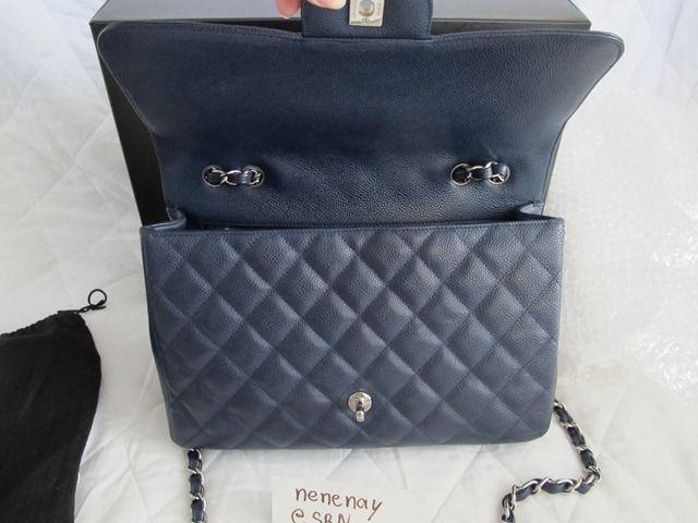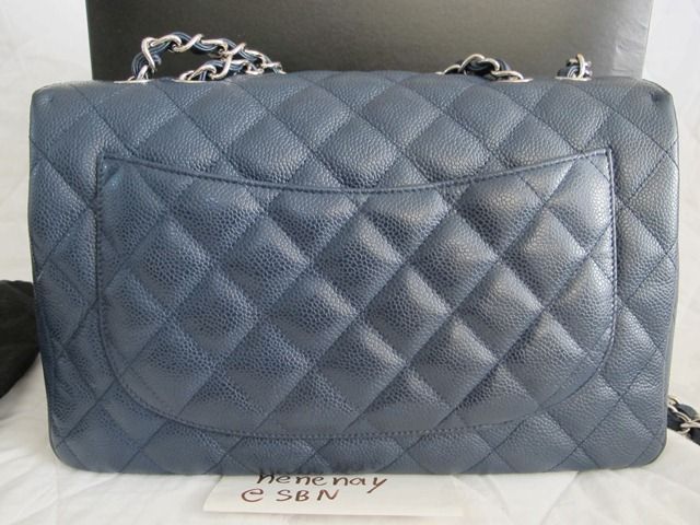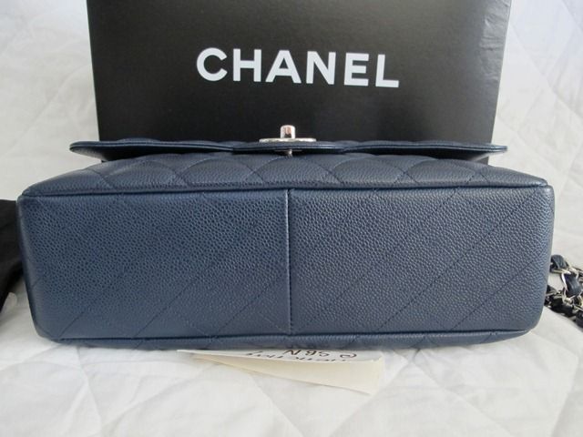 RARE!! USED LIKE NEW CHANEL CLASSIC JUMBO DARK BLUE CAVIAR อะไหล่เงิน สีน้ำเงินเข้ม เย็บขอบ หายากมากๆ รุ่นนี้เป็นแบบฝาเดียว น้ำหนักเบากว่ารุ่นใหม่ๆเยอะค่ะ สภาพสวยเลยค่ะ มุมไม่หัก หนังยังป่อง HOLO 13XXXXXX.