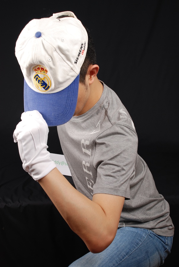 ป้ายชื่อ font เขียว + ถุงมือขาว + กางเกงยีนส์