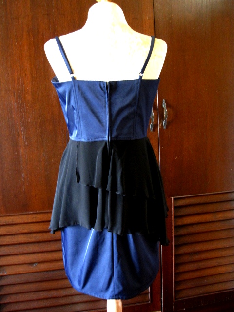 Dress สีน้ำเงินเข้ม หรือ สีกรมท่า ผ้าหนา เนื้อผ้าดีคะ แต่งระบายผ้าชีฟองสีดำช่วงสะโพก ซื้อจาก อเมริกา ใส่ไม่ทันคะ
