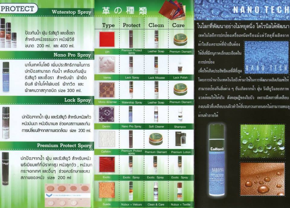 สเปรย์กันน้ำนวัตกรรมใหม่ที่ใช้นาโนเทคโนโลยี สำหรับกระเป๋าผ้าและกระเป๋าหนังพีวีซี โดยทางเทคนิคเป็นการรวมกันของเรซิน fluorocarbon อนุภาคนาโน