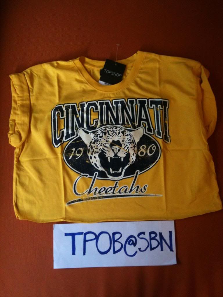 M16 TOPSHOP เสื้อยืดตัวสั้นสีเหลืองลาย cheetahs แบบจอย ชลธิชา