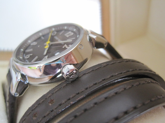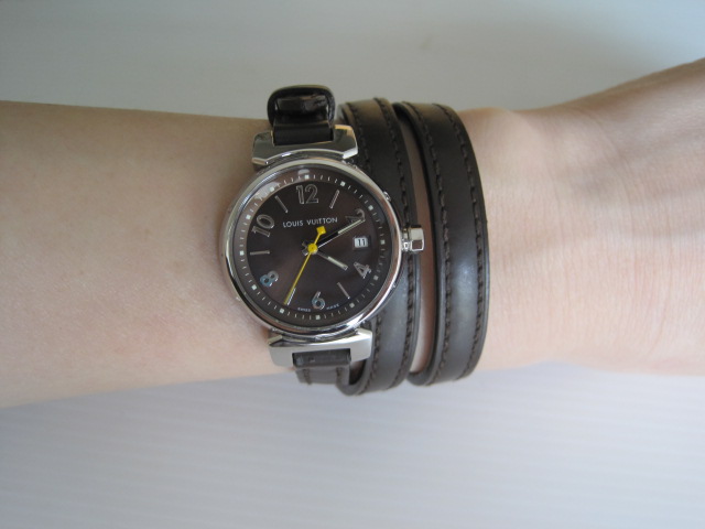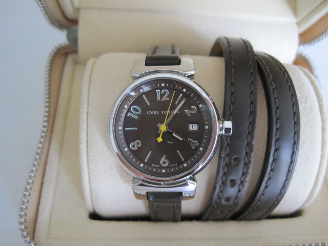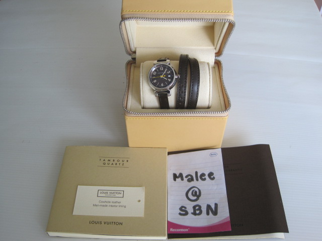 [size=+3]Used Louis Vuitton Tambour Quarth Watch สภาพสวยและค่อนข้างใหม่มากค่ะ สายเป็นรุ่นพัน2รอบ หน้าปัดสีน้ำตาล สายหนังน้ำตาล มีวันที่บอกวันด้วยค่ะ มีพร้อม กล่อง Gaurantee book , Booklet ขาย 57,000>>>>[size=+3]Super Sale 55,000net