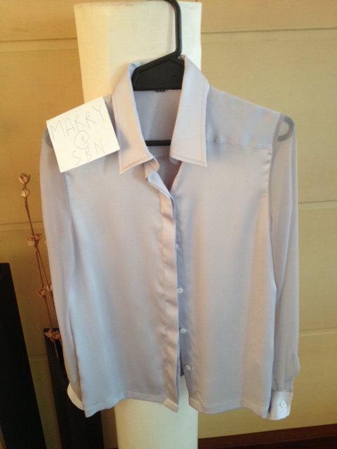 7. เสื้อเชิ้ต vickteerut size xs สีม่วงอ่อน ด้านหลังซีทรู used in good condition ขาย 2000 บาท