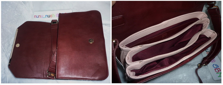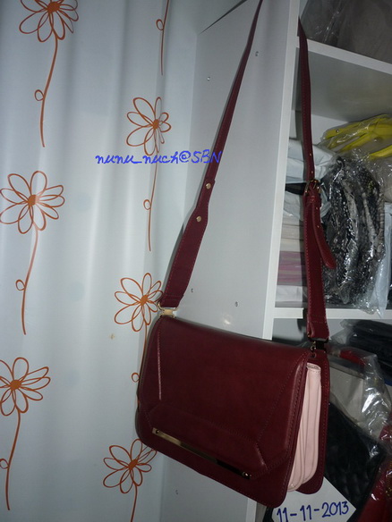 กระเป๋าสะพายข้างสายยาวหนังสวยมาก สีแดง burgundy ภายในมีช่องสีชมพูนู้ดใส่ของได้ 3ช่อง จุของมากมายเลยค่ะ ฝาปิดกระดุมแม่เหล็ก ประดับด้วยขอบเหล็กเก๋ๆ สายสะพายไหล่ปรับความยาวได้ ดูเท่ห์ สวยเก๋