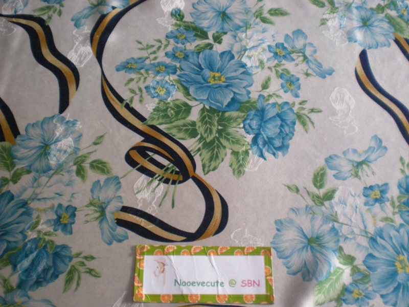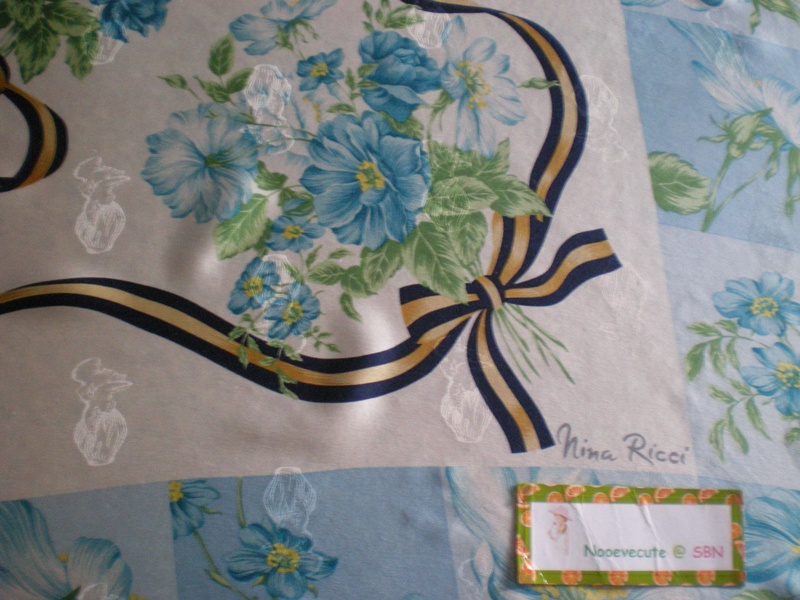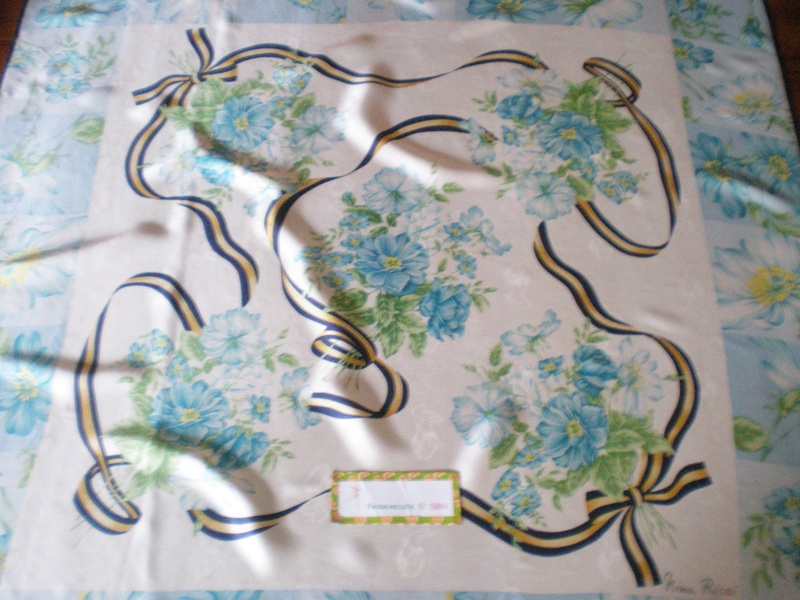 ผ้าพันคอ Nina Ricci สีฟ้าลายดอก หวาน ขนาด 33.5"x34.5" ผ้าบาง เนื้อผ้ามีลายในตัวตลอดผืน no tag ราคา 750 ค่ะ