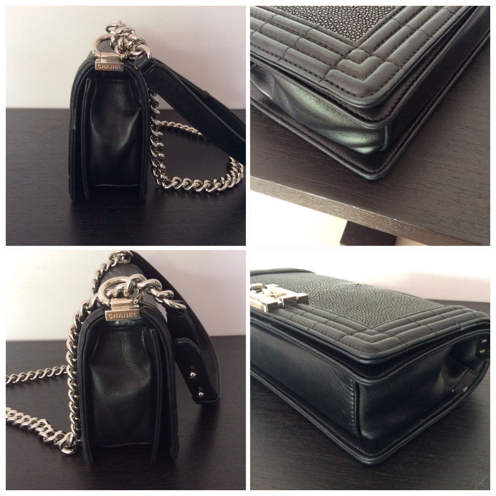 Used Chanel boy black stingray holo161ขนาด 10 " สภาพภายนอกใหม่ ไม่มีริ้วรอย ด้านในเป็นหนังlamb หนังด้านข้างนิ่มลงตามการใช้งาน มีรอยถลอกนิดเดียวที่มุมฝาเปิด มองไม่ค่อยออกคะ โซ่ยังเงาสวยมาก