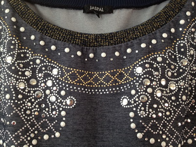 เนื้อผ้าลายเดนิม ติดลายเลื่อมวิ้งๆ คอเสื้อปักด้ายสีทองดูหรูหรา