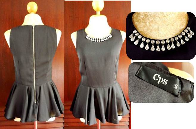 CPS Size S สีจริงดำสนิทนะคะ คริสตัลช่วงอกอยู่ครบทุกเม็ดค่ะ ด้านหลังเป็นซิปโลหะ เนื้อผ้าจะพริ้วๆ ใส่สบายไม่ยับง่ายค่ะ
