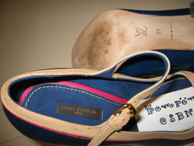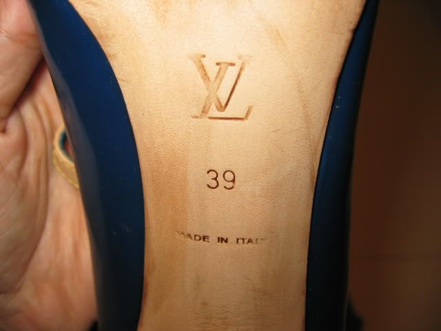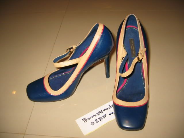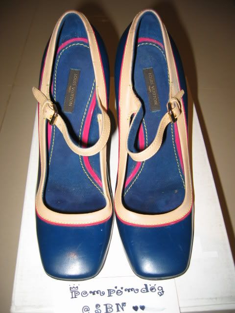 รองเท้าส้นสูง Louis Vuitton size 39 เป็นหนังสีน้ำเงิน ขอบครีม พื้นด้านในเป็นหนังกลับ สภาพใหม่มากๆ พี่สาวซื้อมาเก็บอย่างเดียว