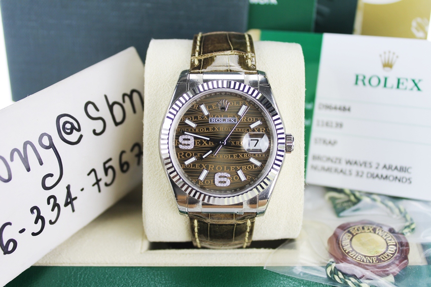 Rolex 116139 18K WhiteGold&RolexBrownLeather D series,Bronze waves 2 arabic numberals 32 diamond,WhiteGold Clasp,engraved,sticker on,comes with booklets and warranty cardราคาออก Shop พร้อมหน้าปัดเพชรตัวนี้ปัจจุบัน สนน ราคาประมาณ 6 แสน + - เล็กน้อย