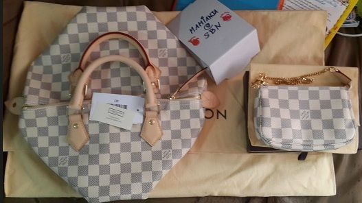 new pochette Damier Azur สายโซ่ทอง(gold chain) ราคาในร้านหมื่นกว่าบาทค่ะ ขายที่ 8000 NET PRICE บาทค่ะมาพร้อมใบเสร็จตัวจริง ถุงผ้า ถุงกระดาษและกล่องค่ะ (เพราะได้ของขวัญใบเล็กเลยอยากได้ใบใหญ่ ^-^) ขอรูปเพิ่มได้เลยค่ะ