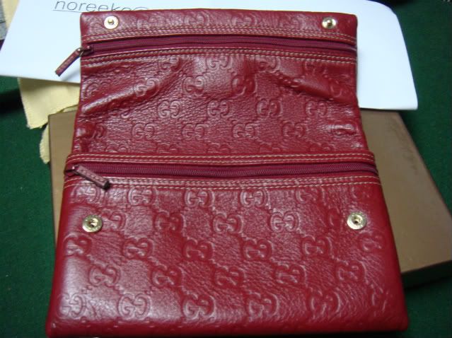 เป็น เป๋า หนีบ gucci สีแดง เป็น หนัง ทั้งใบ ด้านในบุ เป็นหนังกลับ จะทำเป็นหนีบ ไปงาน ก็เก๋ หรือจะใช้เป็น กระเป๋า