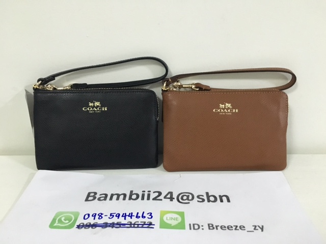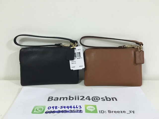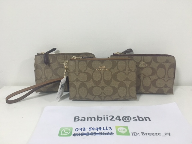 COACH F64131 DOUBLE CORNER ZIP WRISTLET IN SIGNATURE ขนาด 6 1/4"(L) x 4"(H) กระเป๋าคล้องมือ รุ่น2ซิป มีสายคล้องข้อมือ ถอดออกได้ ถือเป็นคลัช เก๋ๆ ใส่ไอโฟน6 , 6s ได้สบายมากคะ ด้านในมีช่องเสียบบัตรนะคะ มีซิป3สีตามรูปคะ เลือกได้เลยค่าาา สินค้ามาพร้อม ป้ายราคา แคร์การ์ด ราคา 1890 บาท