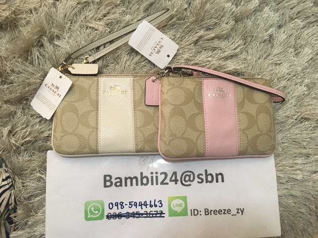 COACH f64233 CORNER ZIP WRISTLET IN SIGNATURE COATED CANVAS WITH LEATHER มี 2 สี คาดขาว กับ คาดชมพู