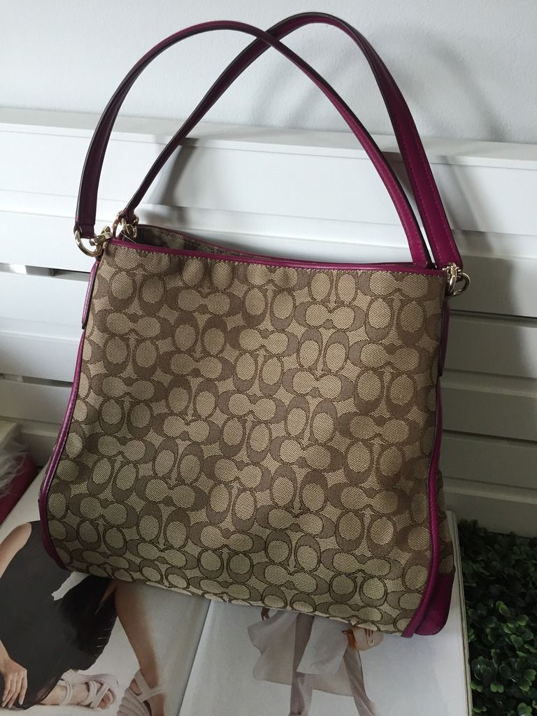 COACH HANDBAGS f36424 PHOEBE SHOULDER BAG IN OUTLINE SIGNATURE เป็นผ้าลายโค้ช มีซิปกลาง ด้านข้างสองช่องจุของมากมาย Size: 13 1/2" (L) x 11 1/2" (H) x 5 3/4" (W) สีดำ น้ำตาล ม่วง 5290 รวม ems สีชมพู ราคา 4990 รวม EMS