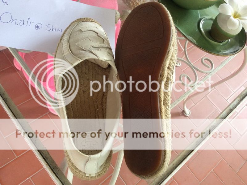 -Used รองเท้า Tory Burch สีครีม ตัวรองเท้าเป็นผ้า มีลาย Logo สภาพดี เพิ่งได้มาจาก ใน SBN แต่ใส่ไม่ได้มันคับไป