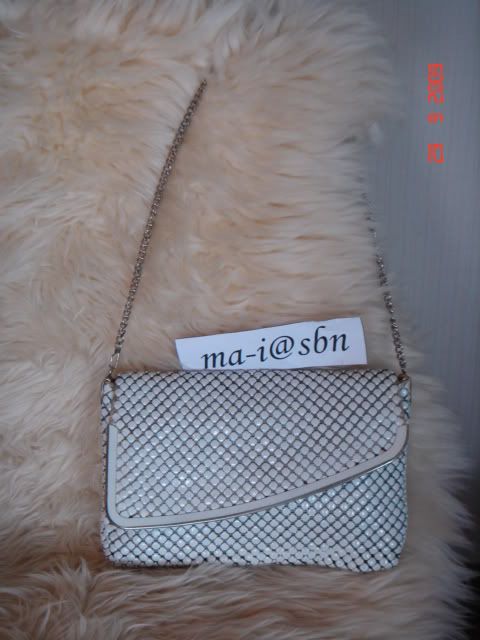 5. กระเป๋า vintage clutch สีขาว ใบนี้น้องสาวฝากขาย ซื้อที่ร้านขายของมือสองที่อังกฤษ ด้านนอกเป็นเหมือนเหล็กสีขาวถักด้วยเหล็กอีกที (ของจริงสวยมากนะคะ) ด้านนอกยังสวยอยู่ แต่ด้านในมีเลอะบ้าง ตามรูปเลยอะคะ แต่ไม่มีขาดนะคะ สายโซ่เงินยังวาวคะ ขนาด กว้าง 9.5 สูง 6 นิ้ว ขอขาย 180 บาท (SOLD)
