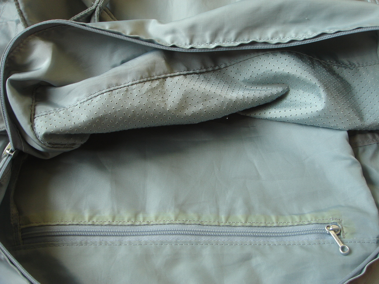 รอบๆซิปข้างในเป็นสีเหลืองๆ จำไม่ได้ว่ามีมาแต่เดิมหรือว่าเพิ่งมีหรือเปล่าค่ะ มีกระเป๋าใส่ของได้หลายอย่างค่ะ เบามาก