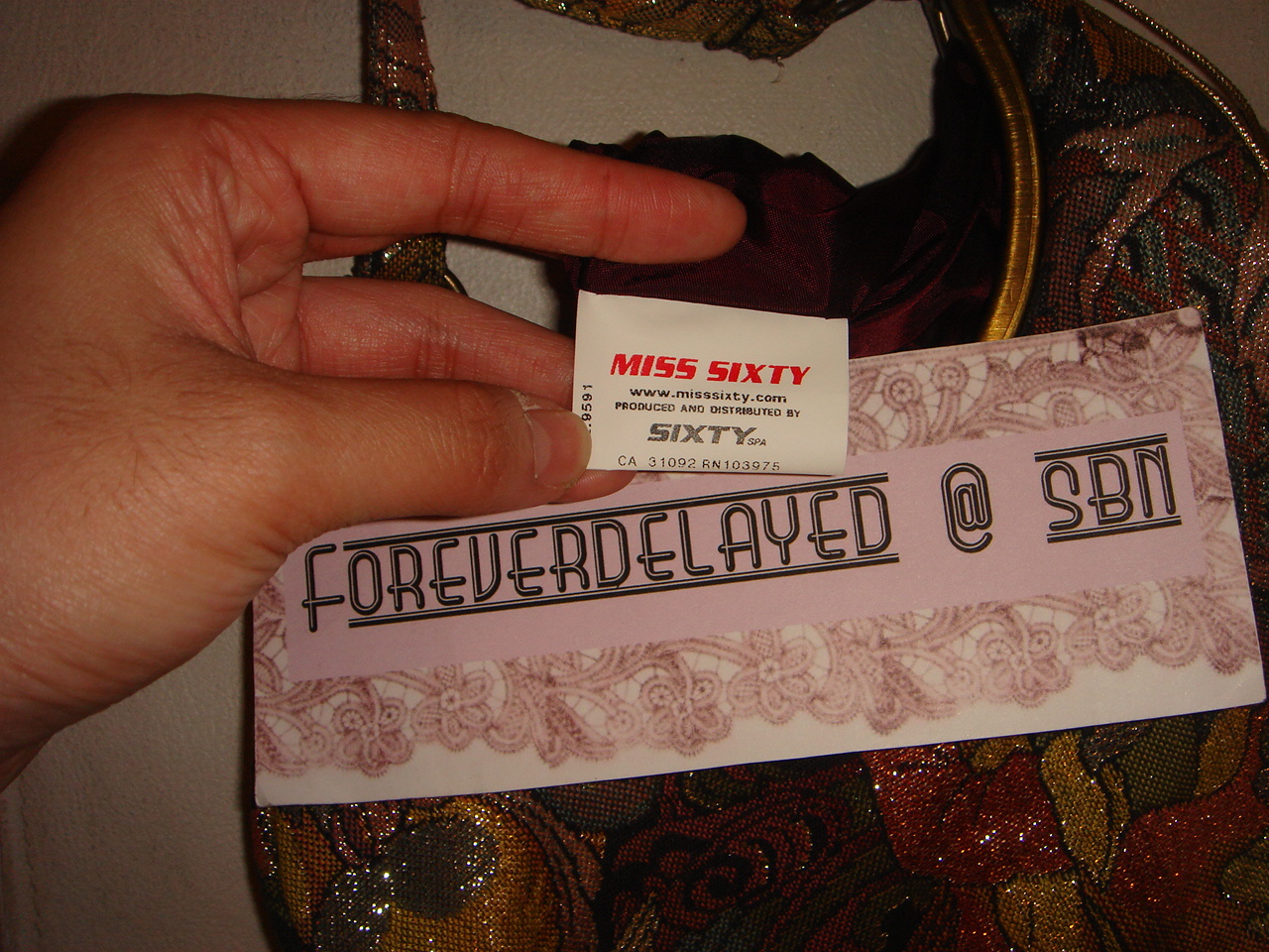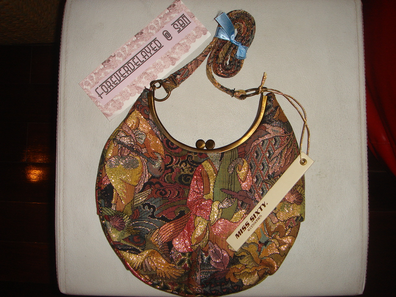 3.กระเป๋า Miss Sixty เป็นลายปักขอบทอง MADE IN ITALY ใหม่ค่ะ มีป้ายติด ยังไม่ได้ใช้ กว้าง 9" ยาว9" สายสะพายข้างได้อย่างเดียวค่ะ