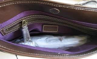 Internally the bag is lined with purple canvas and has two small pockets, one of which is zip fastening.