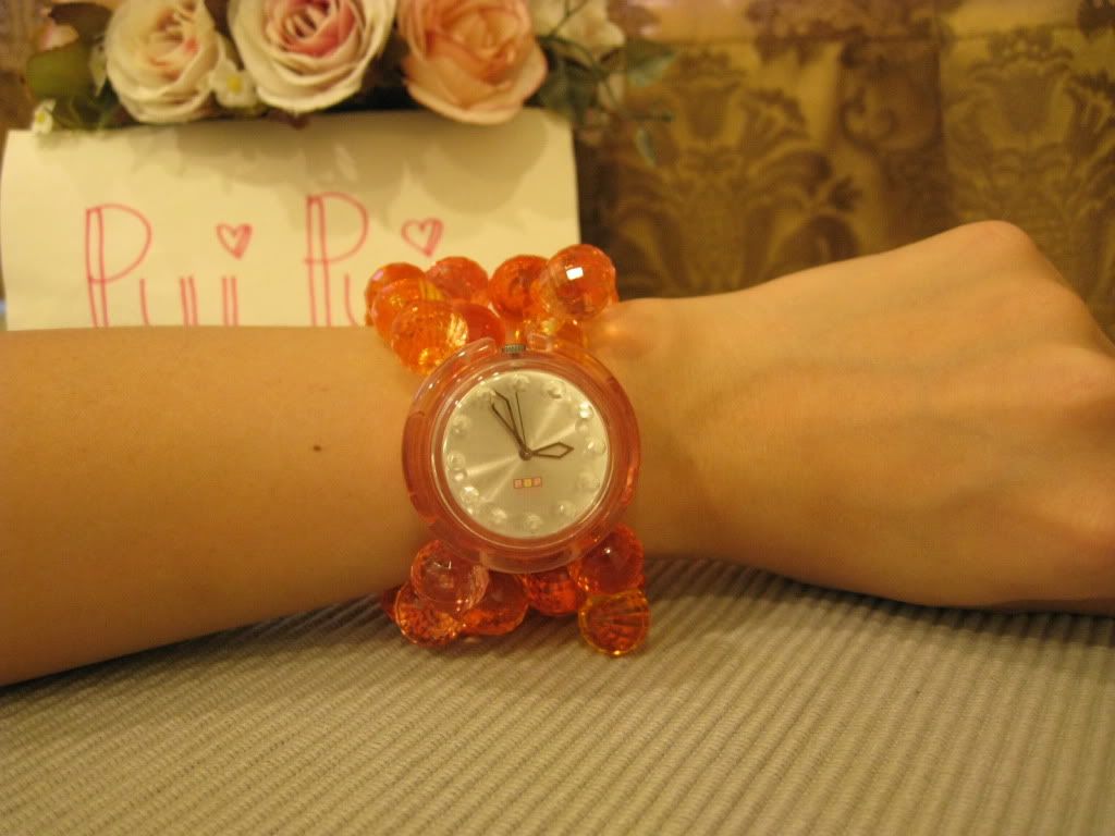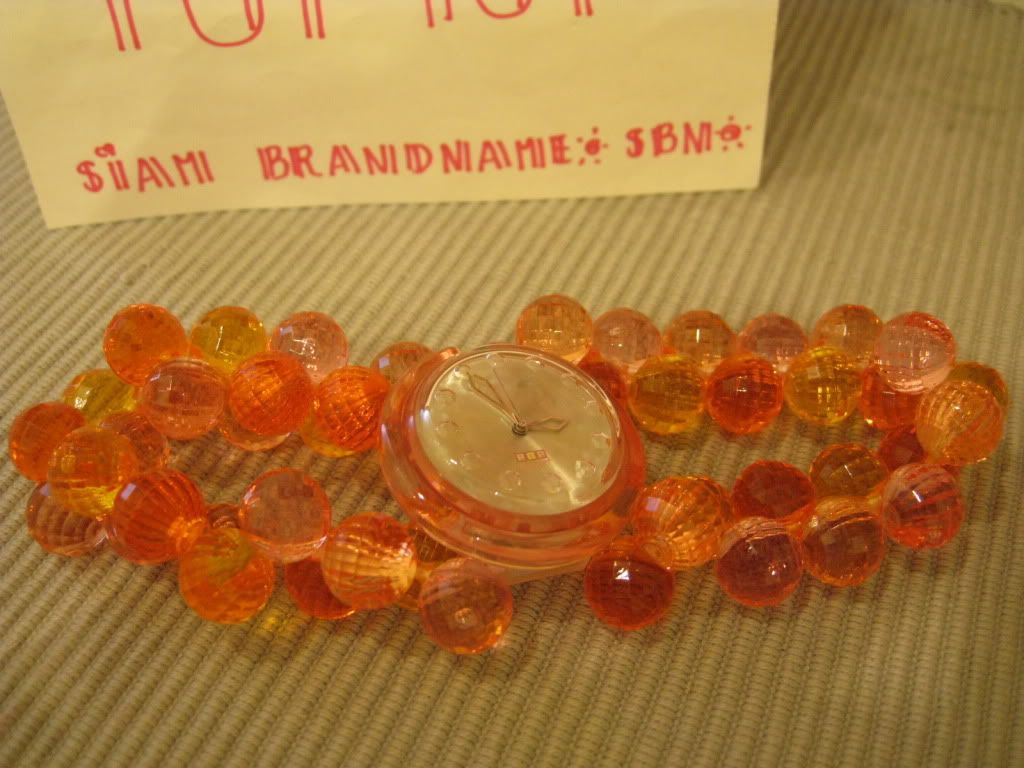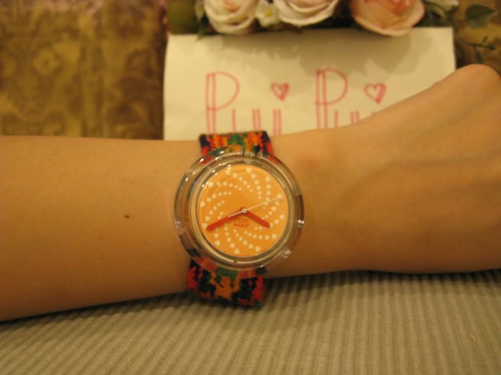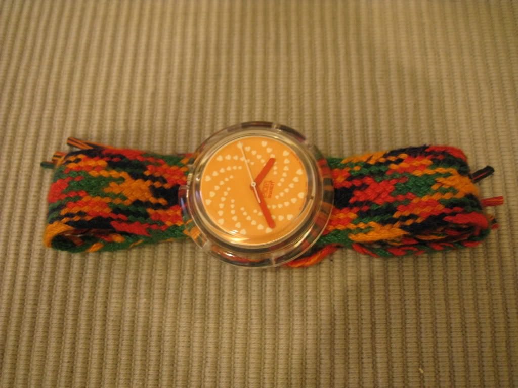 นาฬิกา Pop Swatch สายถักสีออกโทนส้มนะคะ ผูกกับข้อมือด้านหลัง ใส่เท่ห์ๆค่ะ