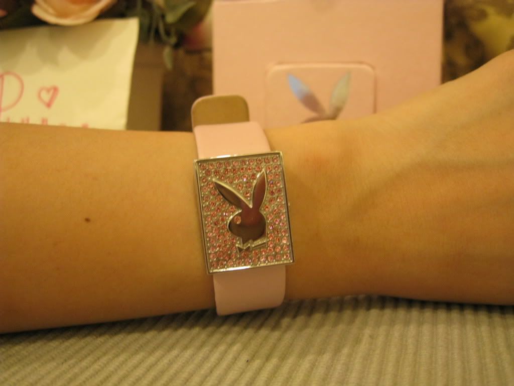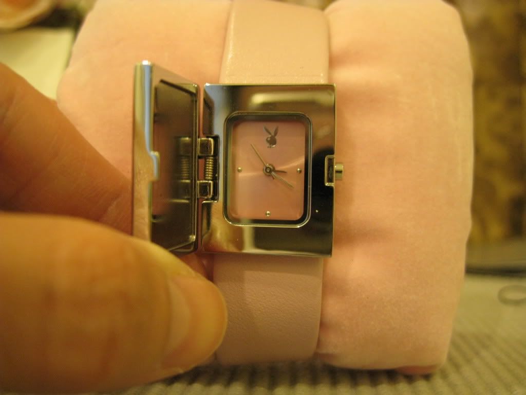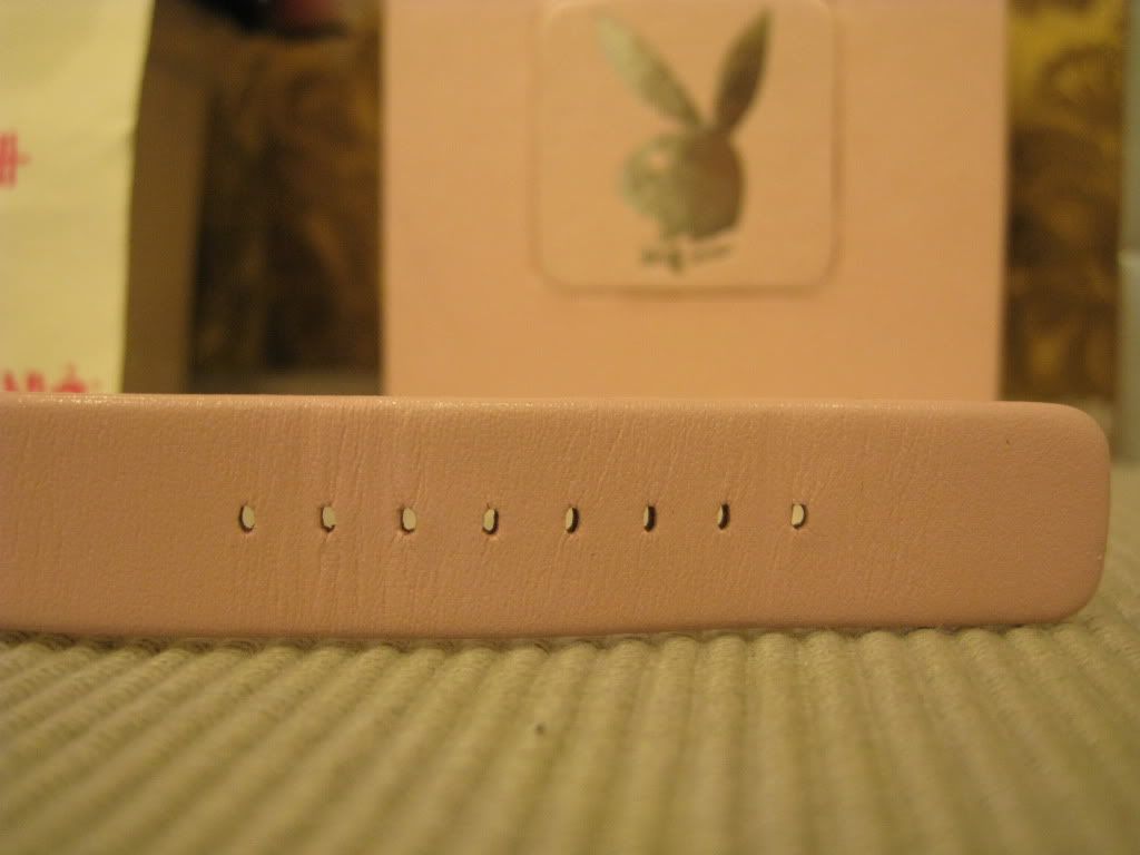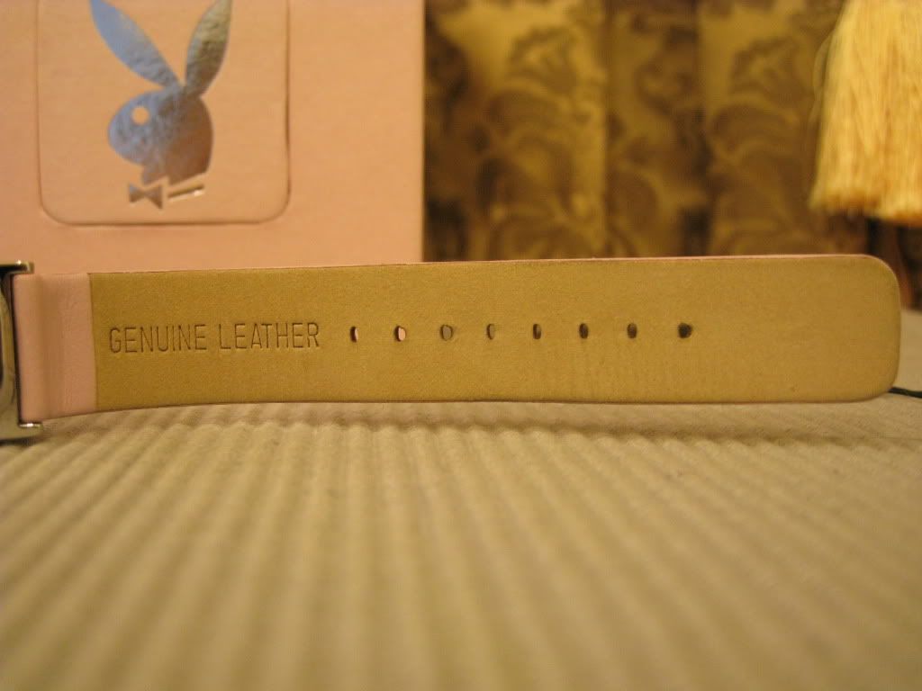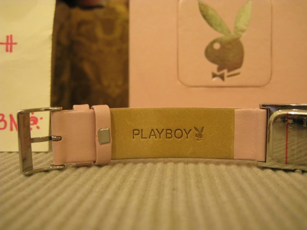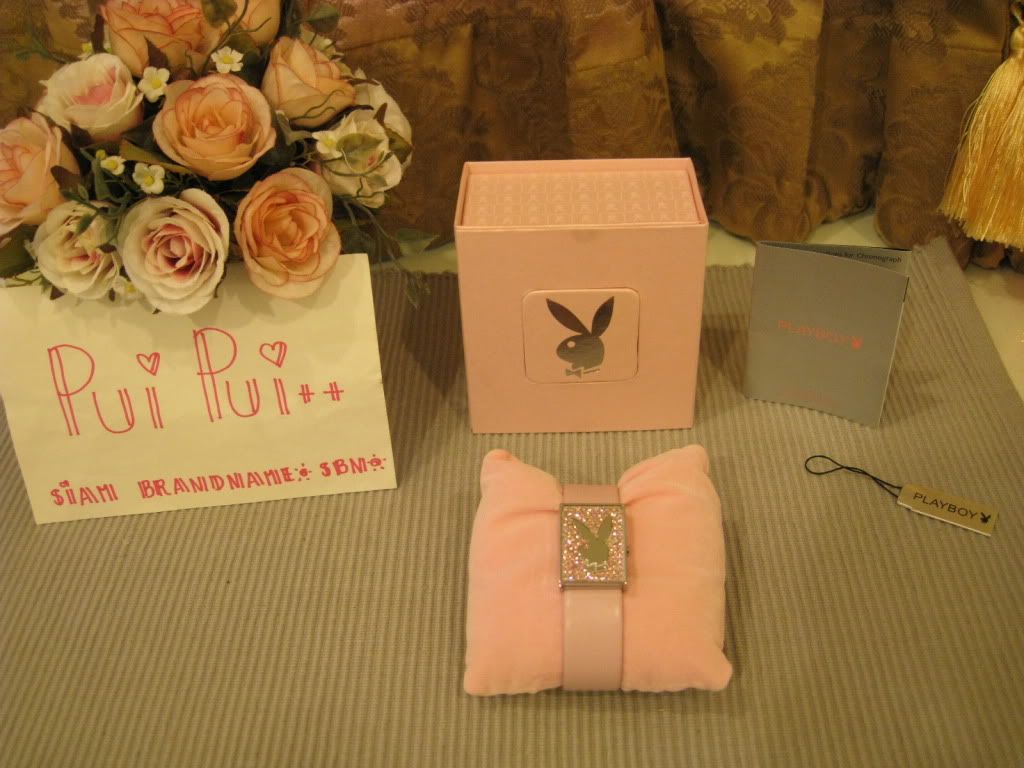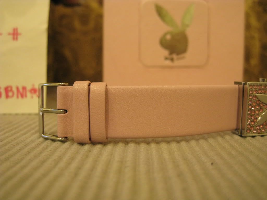 นาฬิกา playboy เพชรคริสตัลสีชมพูตรงตัวโลโก้ มาพร้อมกับสายหนังสีชมพูอ่อน