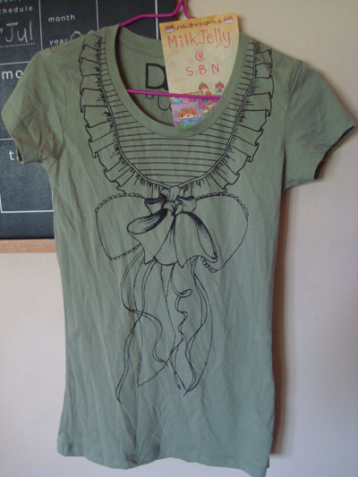 53. DOE for U.O แบรนด์เมืองนอกค่ะ เสื้อยืดพิมพ์ลายโบว์ สีเขียวเทา ของใหม่ ไซส์ S ค่ะ