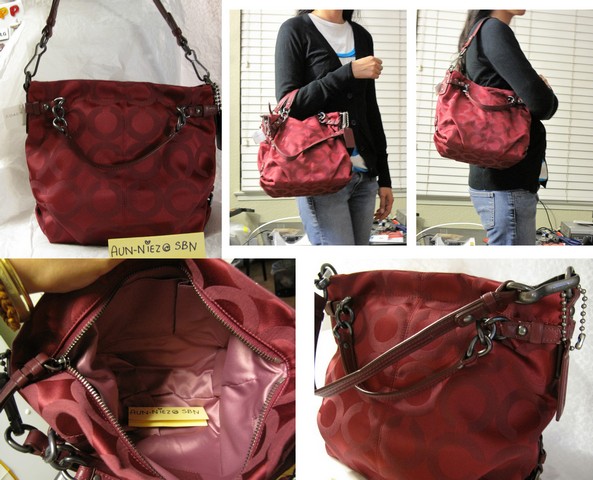 รุ่น F14147 ขนาดb13 (L) x 12 (H) x 4 (W) สะพายก็ได้หิ้วก็ได้คะ สายสะพายยาว 13 นิ้ว สายหิ้วยาว 8 นิ้ว กระเป๋าจุของได้มากมาย สีแดงเข้มไม่เปรี้ยวเกิน แต่ก็ไม่ดูน่าเบื่อคะ หิ้วได้นานคะ